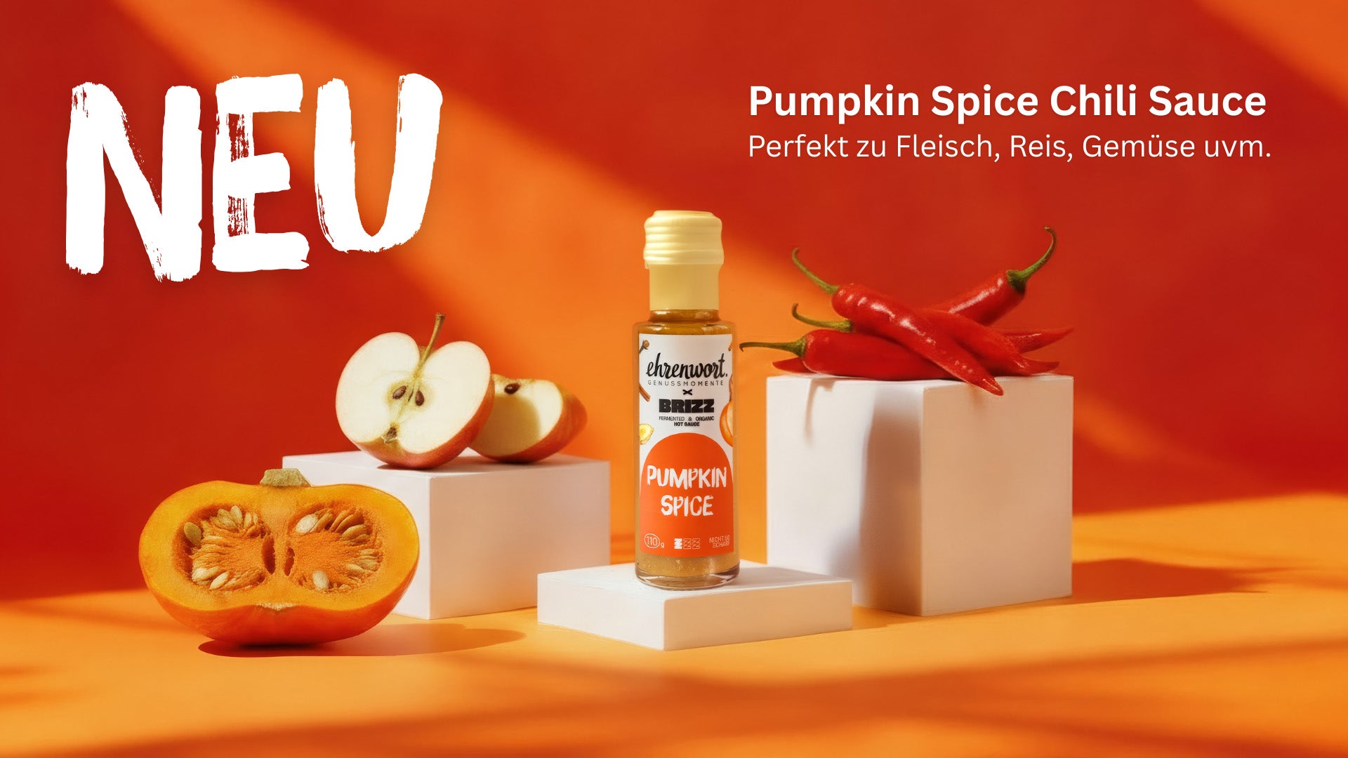 Fruchtig-scharfes Hühnchen mit Ofengemüse – verfeinert mit der ehrenwort. Genussmomente BIO Pumpkin Spice Hot Sauce: herbstlich, mild-würzig und unwiderstehlich aromatisch. Rezept-Tipps inklusive Veggie-Varianten!